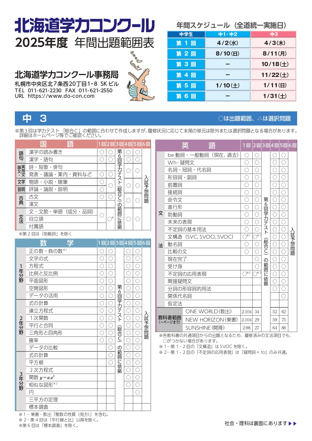 8月10日(中学1,2年生)と8月11日(中学3年生)に北海道学力コンクール(道コン)があります。