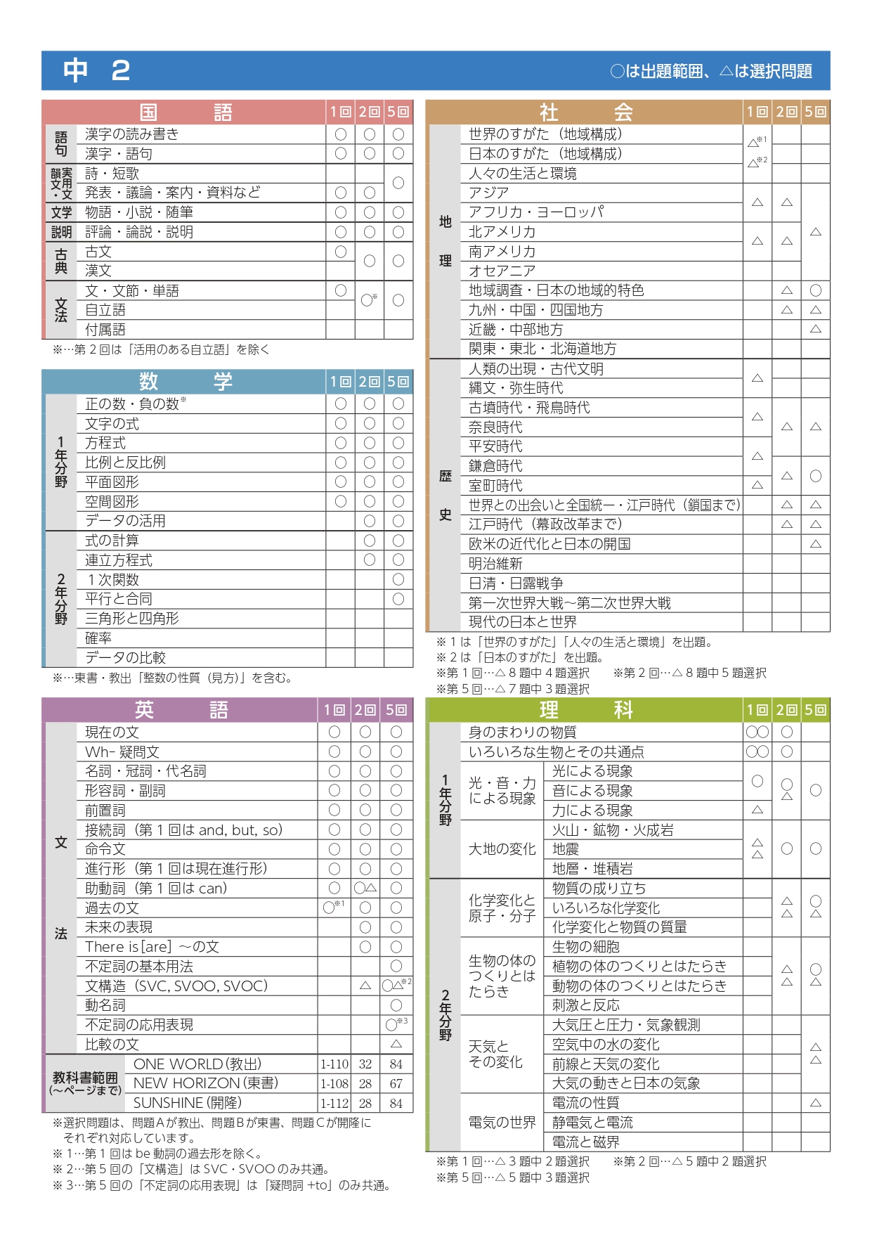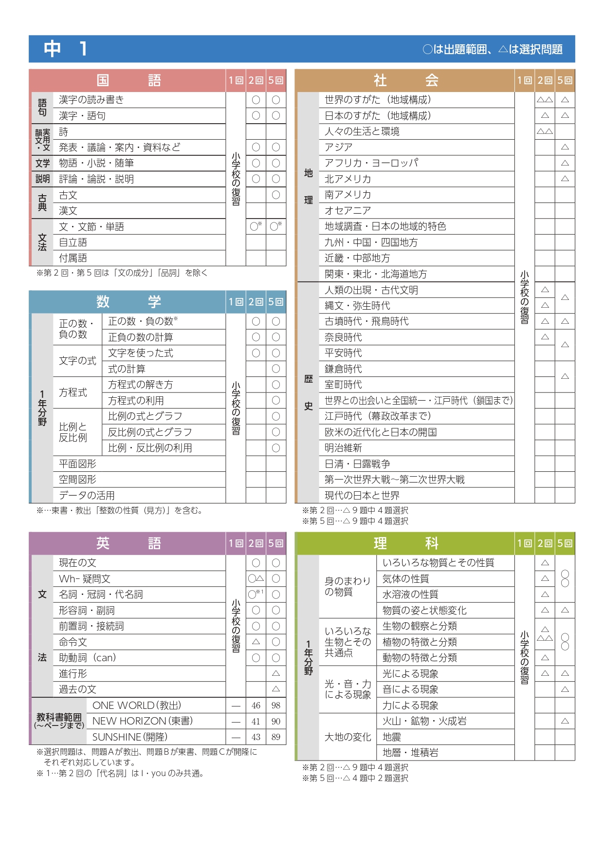 上記のテスト範囲表を見ると、今年度の1学期までに習った部分が範囲になっていることがわかります。